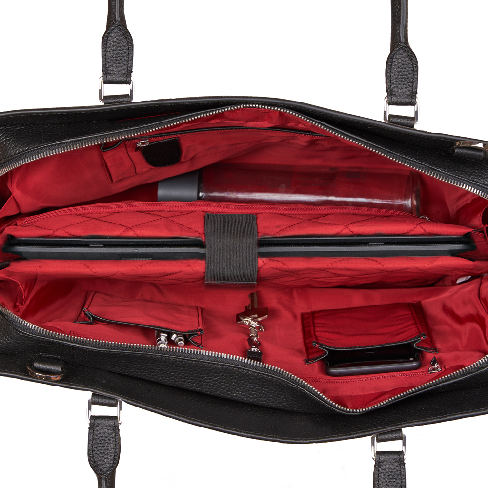 1 Laptopfach, gepolstert m. RV-Fach, 1 Handyfach, 3 Steckfächer, 3 Fächer für Kugelschreiber, 1 Fach mit LED-Licht, 1 Schlüsselhalter m. Karabinerhaken, 2 Reissverschlussfächer, 1 Reissverschlußöffnung groß , 1 Trolley Befestigungsschlaufe, 1 Reissverschlußfach a. d. Rückseite, 2 Geheimfächer, 1 Tragegriff, 1 Trageriemen abnehm- und verstellbar, Entdecken Sie unsere luxuriöse Echtleder-Handtasche mit herausnehmbarer Laptoptasche für ultimative Vielseitigkeit. Der verstellbare Trageriemen sorgt für Komfort. Integriertes LED-Fach Licht nicht enthalten . Ausgestattet mit Mobil- und Kugelschreiberfach und praktische Trolley-Schlaufe für müheloses Reisen. Ideal für den modernen Lifestyle.