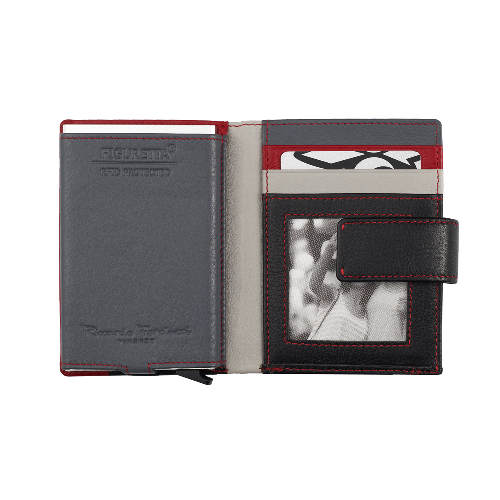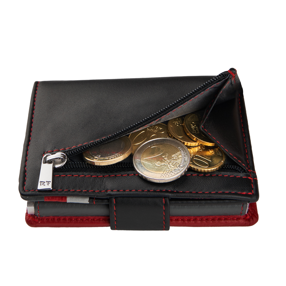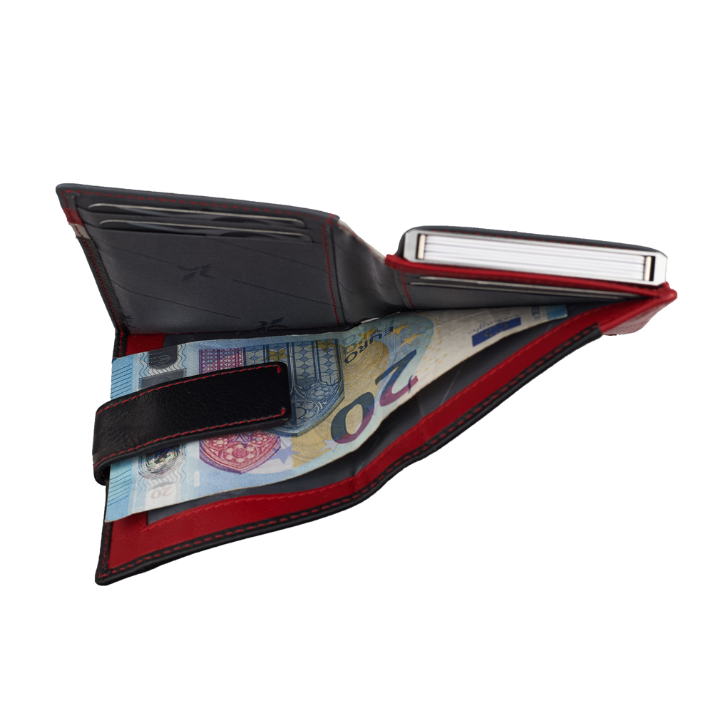 1 RFID Hacker Protection, 1 Metal Cardprotector – für 6 Kreditkarten, 1 Münzfach mit RV und Falte, 2 Kreditkartenfächer, 1 Fotofach, 1 Notenfach, 4 Kreditkartenfächer im Notenfach, 2 Steckfächer, 1 Sicherheitsverschl. mit Druckknopf, außen