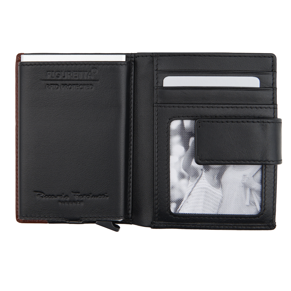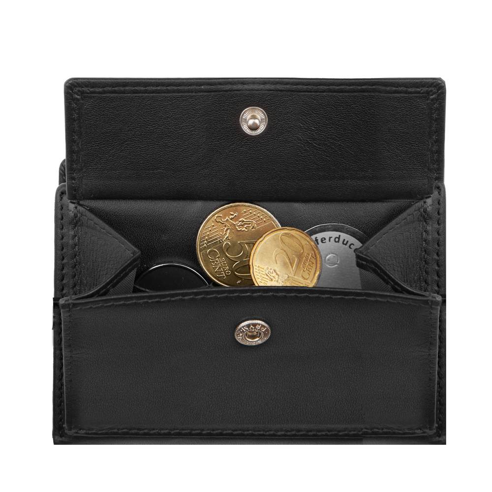 1 RFID Hacker Protection, 1 Metal Cardprotector – für 6 Kreditkarten, 2 Kreditkartenfächer, 2 Steckfächer, 1 Klarsichtfach, 1 Münzfach, 1 Fach für Einkaufswagen-Jeton inkl. Jeton, 1 Fach für den Schlüssel, 1 Notenfach, 4 Kreditkartenfächer im Notenfach, 1 Sicherheitsverschl. mit Druckknopf, außen