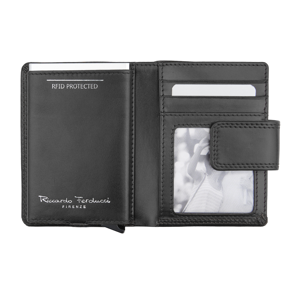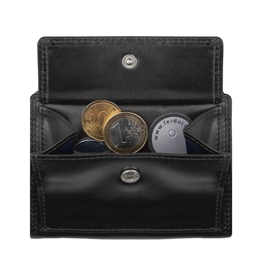 1 RFID Hacker Protection, 1 Metal Cardprotector – für 6 Kreditkarten, 3 Kreditkartenfächer, 2 Steckfächer, 1 Klarsichtfach, 1 Münzfach, 1 Fach für Einkaufswagen-Jeton, 1 Fach für den Schlüssel, 1 Notenfach, 4 Kreditkartenfächer im Notenfach, 1 Sicherheitsverschl. mit Druckknopf, außen