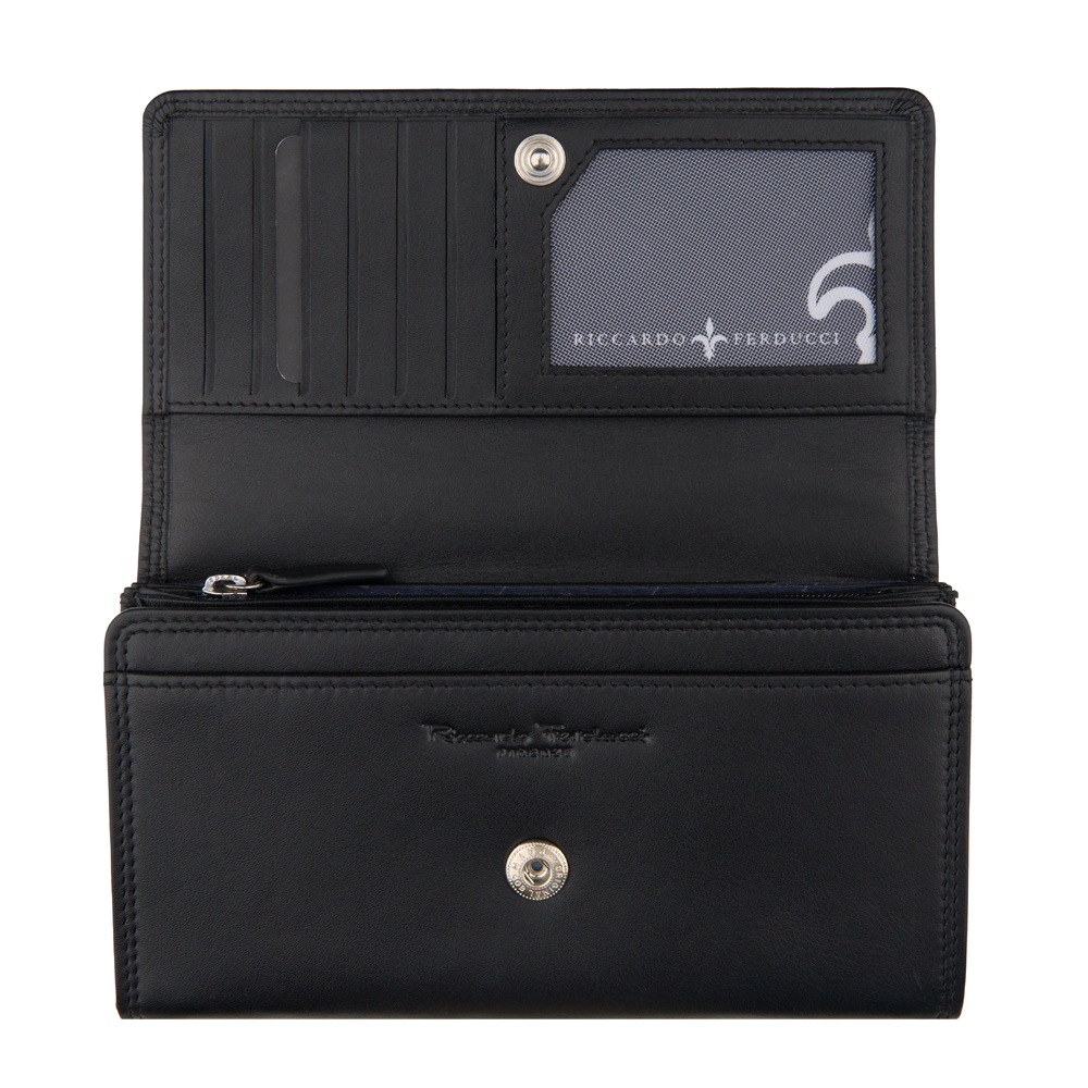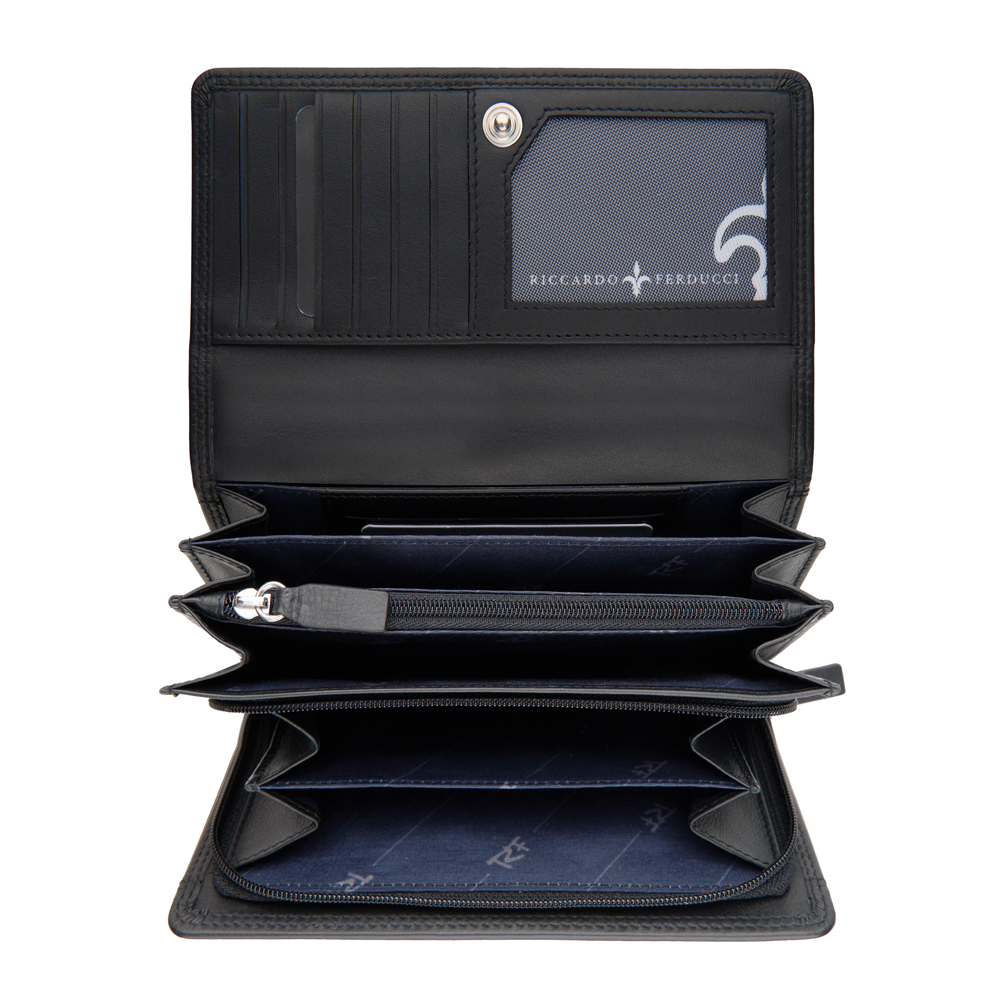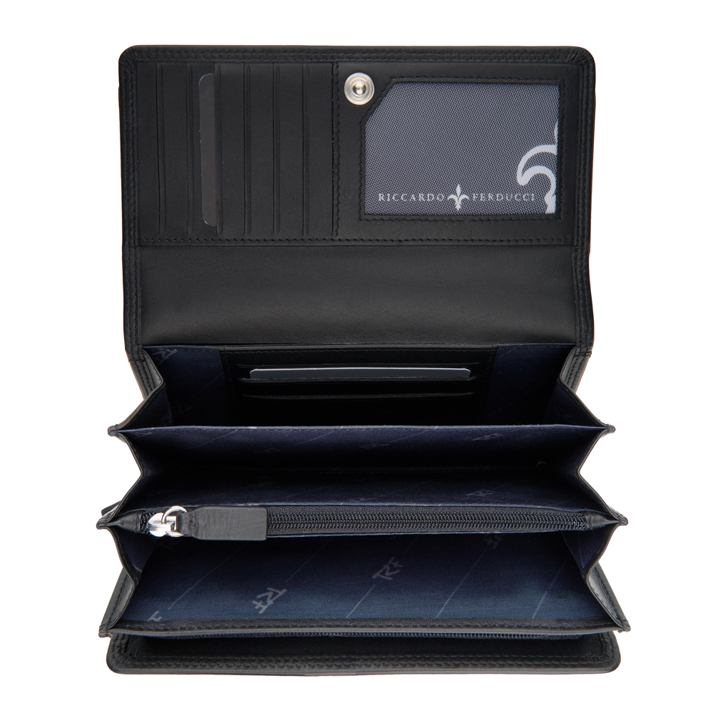 1 RFID Hacker Protection, 6 Kreditkartenfächer, 3 Kreditkartenfächer im Notenfach, 1 Fotofach, 1 Münzfach geteilt, mit RV, 3 Notenfächer, 3 Steckfächer, 1 Reissverschlussfach, 1 Steckfach aussen