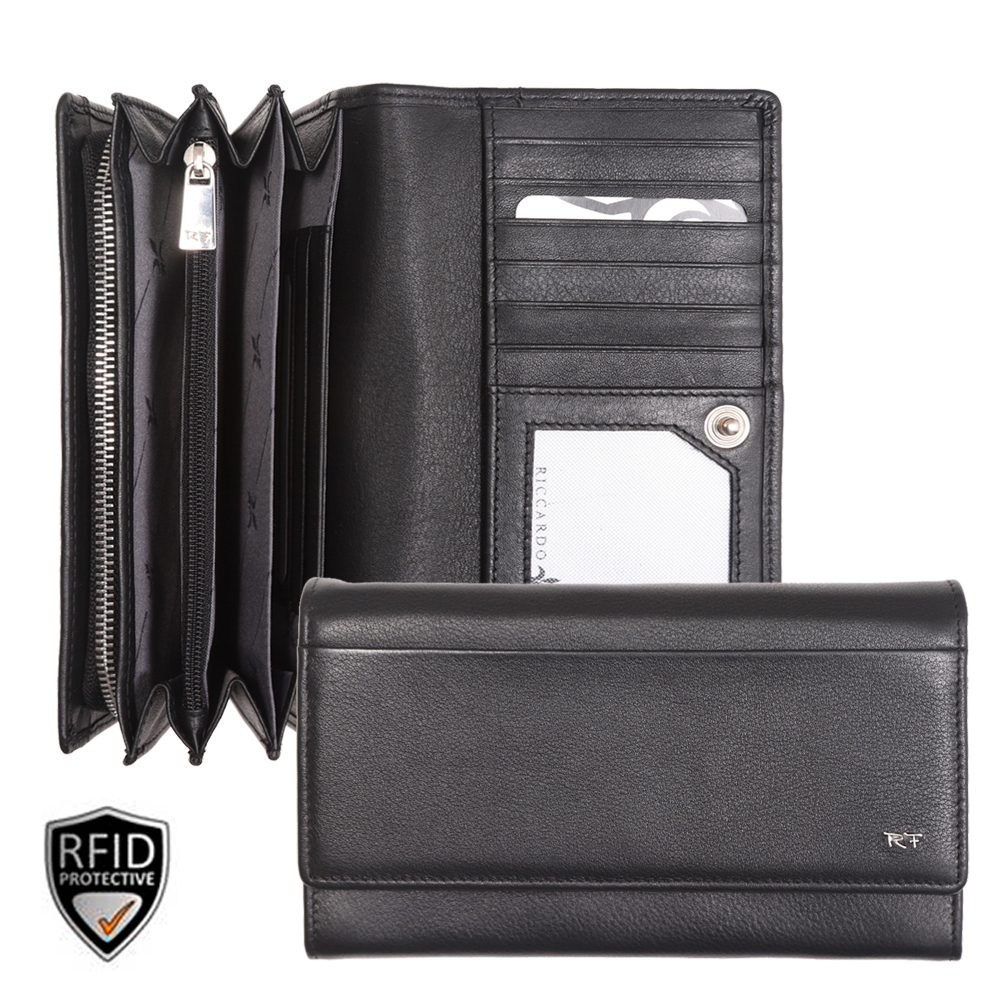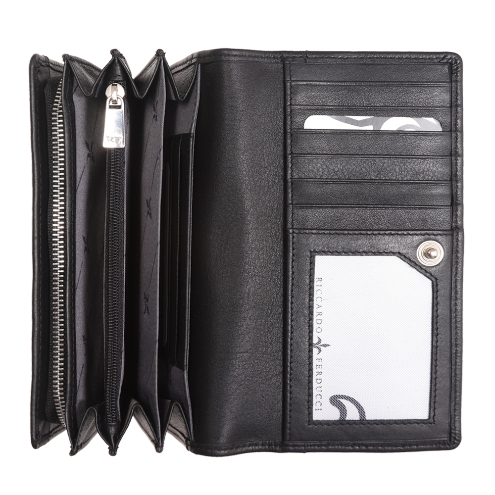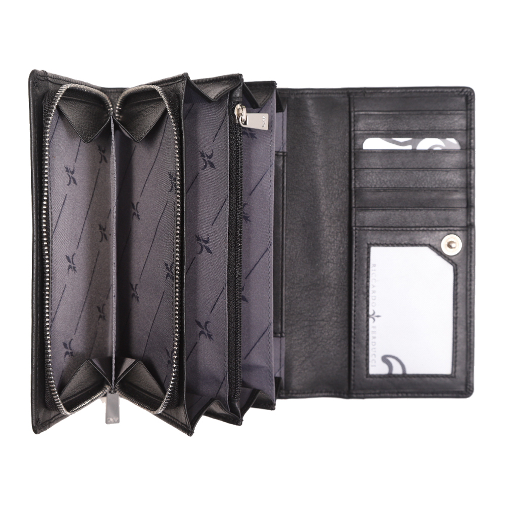 1 RFID Hacker Protection, 6 Kreditkartenfächer, 3 Kreditkartenfächer im Notenfach, 1 Fotofach, 1 Münzfach, 3 Notenfächer, 2 Steckfächer, 1 Reissverschlussfach, 1 Steckfach aussen