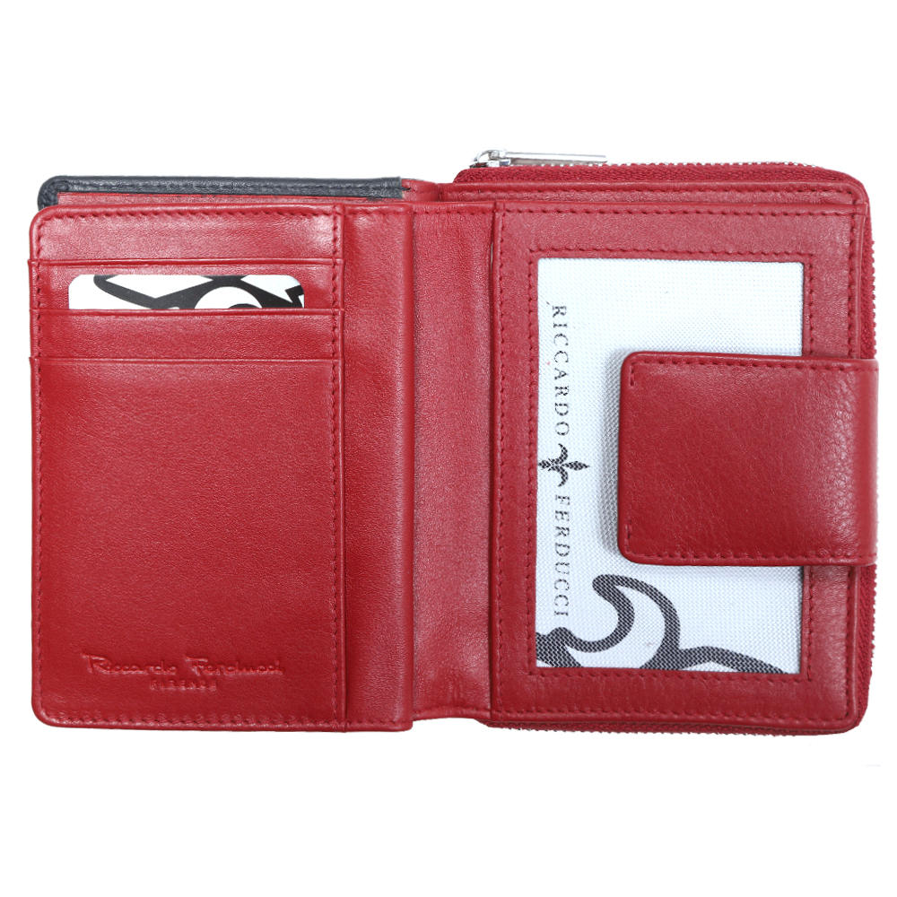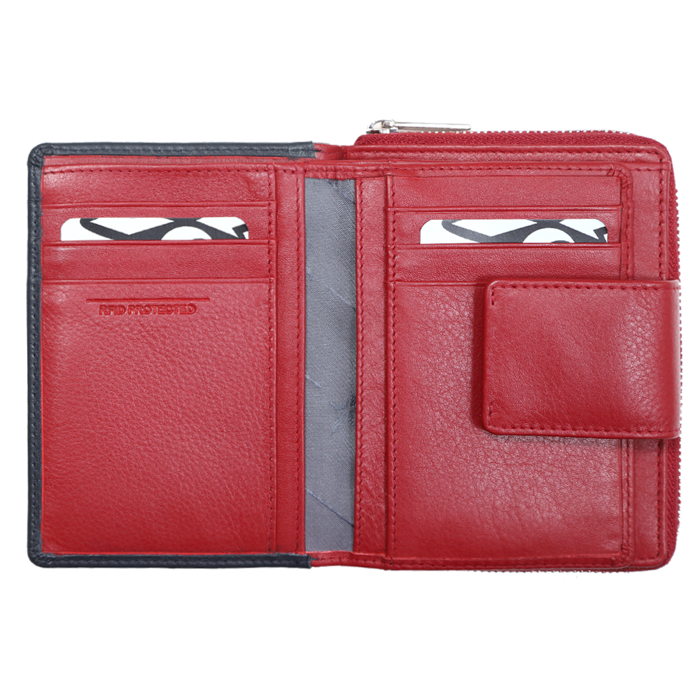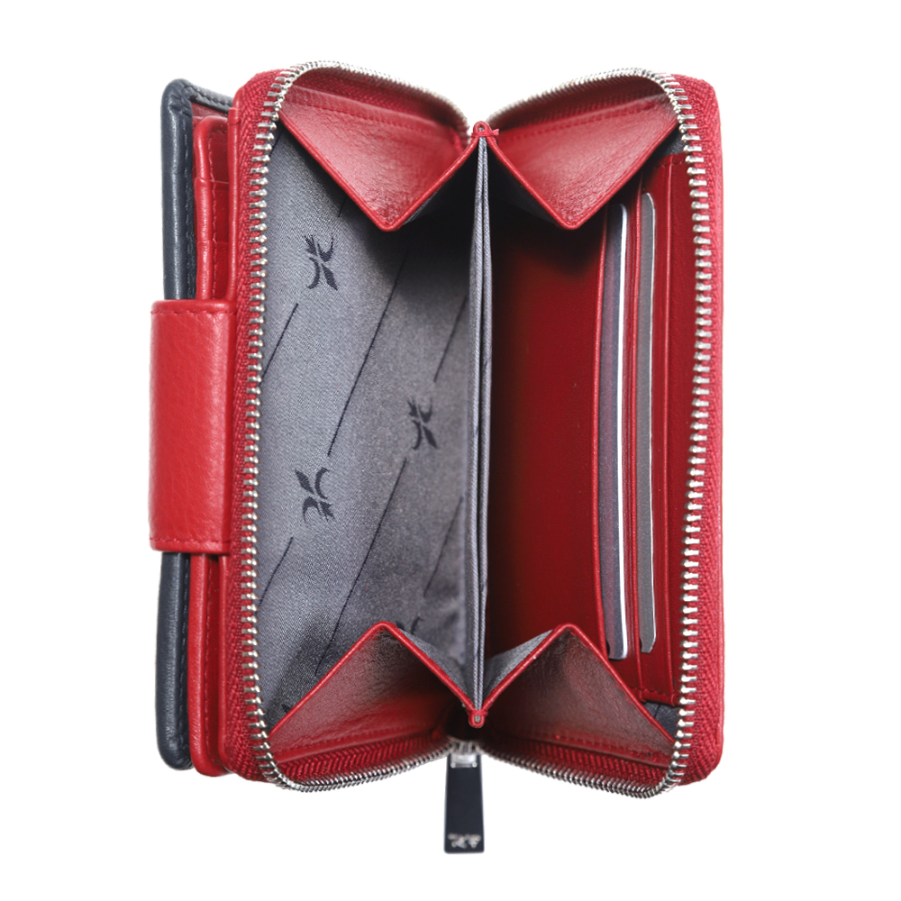 1 RFID Hacker Protection, 12 Kreditkartenfächer, 1 Fotofach, 1 Münzfach geteilt, mit RV, 1 Notenfach, 6 Steckfächer, 1 Sicherheitsverschl. mit Druckknopf, außen, 1 Steckfach aussen