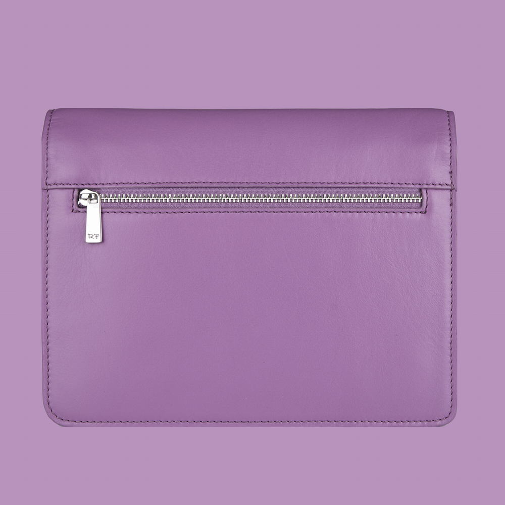 2 Hauptfächer, 1 Reissverschlussfach, 1 Steckfach, 2 Kreditkartenfächer, 1 Kugelschreiber-Schlaufe, elastisch, 1 Trageriemen abnehm- und verstellbar, 1 Magnetverschluss, 1 Reissverschlußfach a. d. Rückseite, verziert mit 395 Kristallen aus Österreich