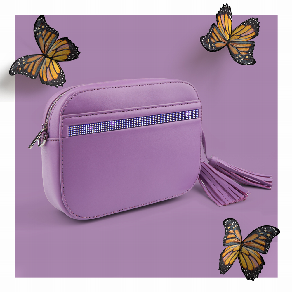 1 Hauptfach, 1 Reissverschlussfach, 1 Steckfach, 1 Kugelschreiber-Schlaufe, elastisch, 1 Trageriemen abnehm- und verstellbar, 1 Steckfach aussen, verziert mit 395 Kristallen aus Österreich
