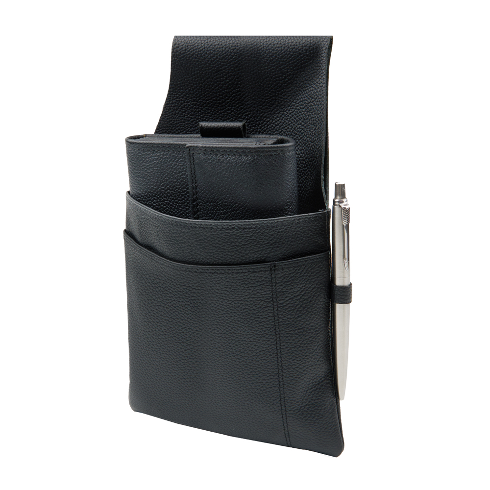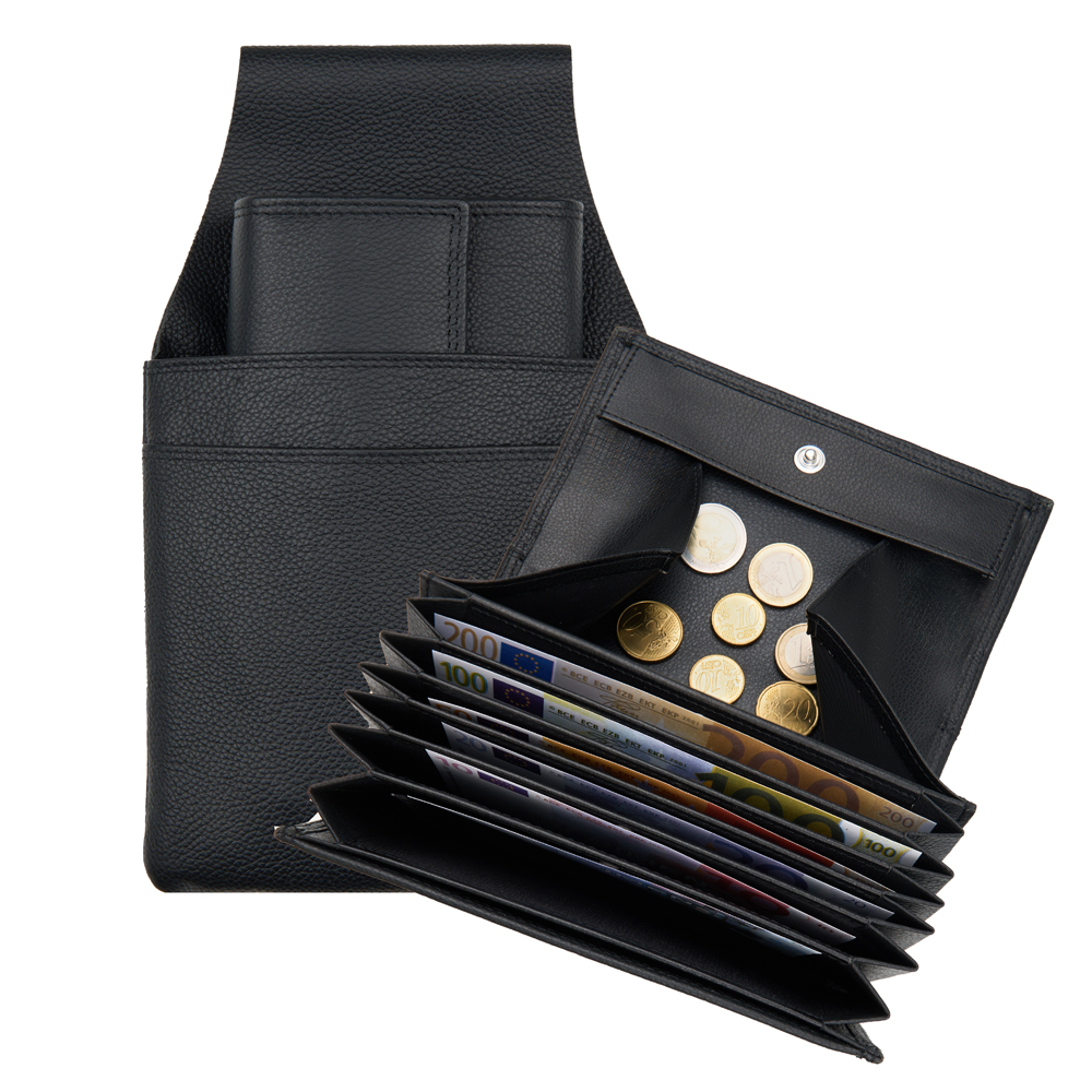 6 Notenfächer, 1 Münzfach mit Schüttrand, 1 Steckfach, 1 Steckfach aussen, 1 Öse für Kettenanbringung, 2 Druckknöpfe, Doppelsteppung mit Koban-Faden. + Halfter für Kellnerbörse