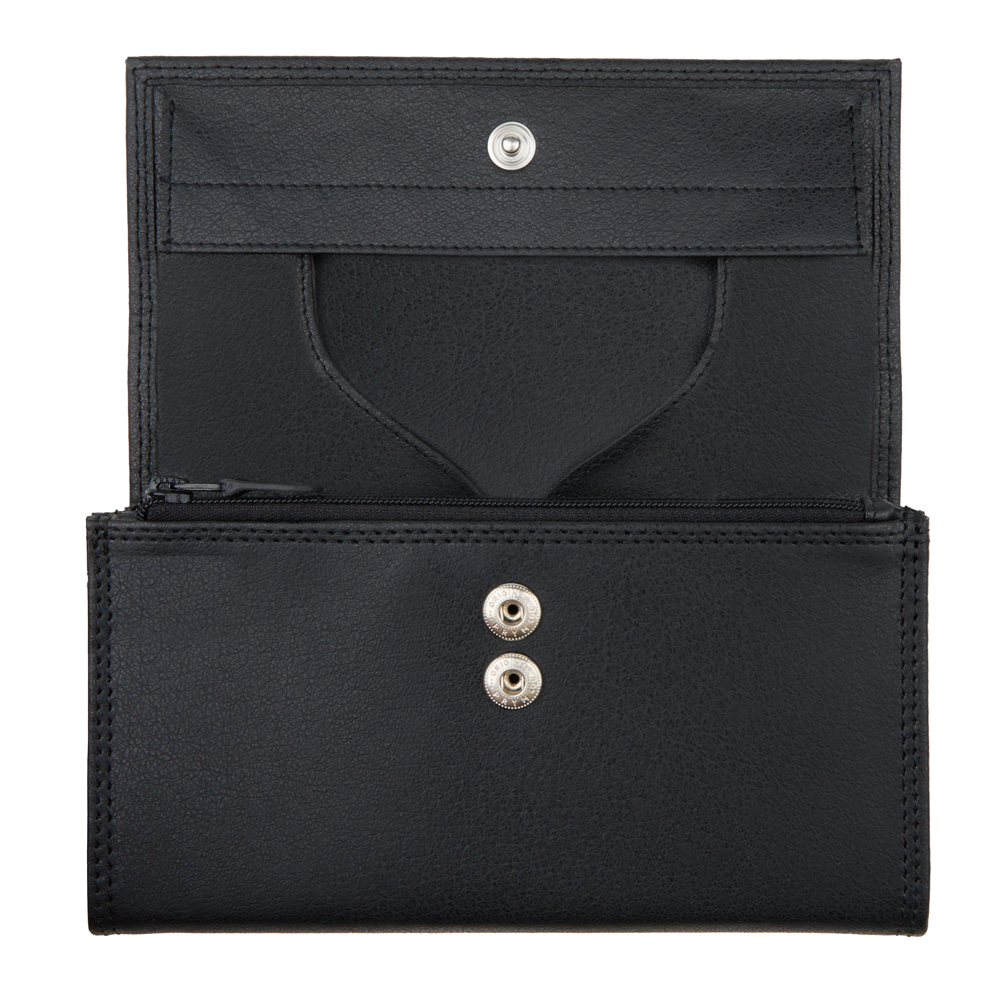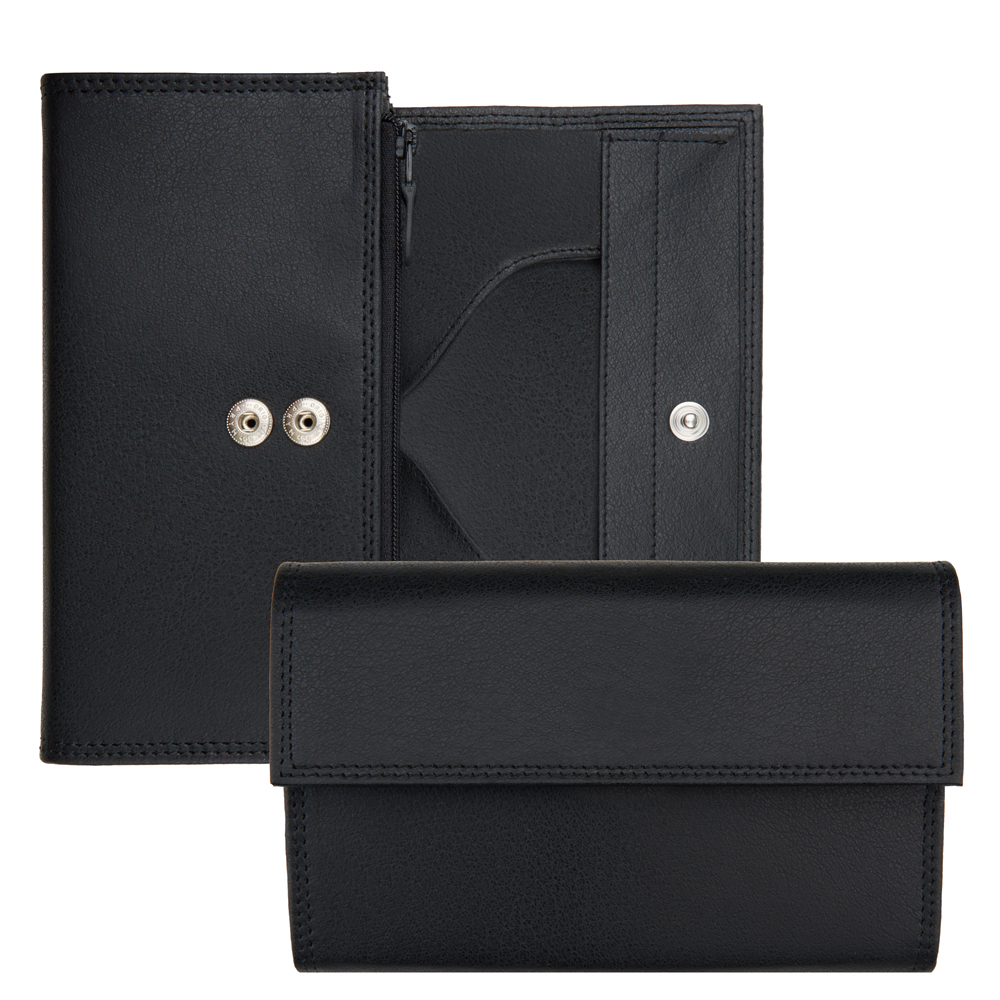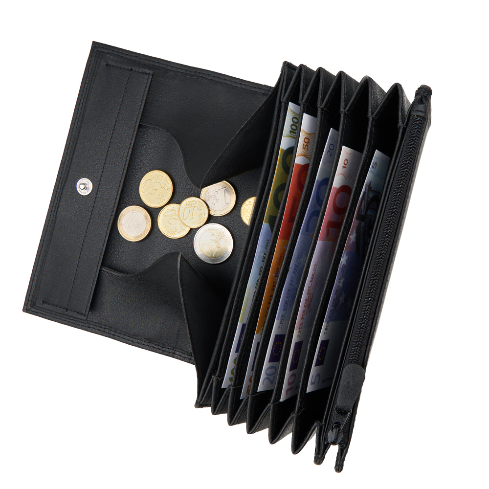 5 Notenfächer, 1 Reissverschlussfach mit Quetschfalte, 1 Münzfach mit Schüttrand, 2 Steckfächer, 1 Steckfach aussen