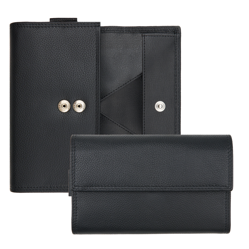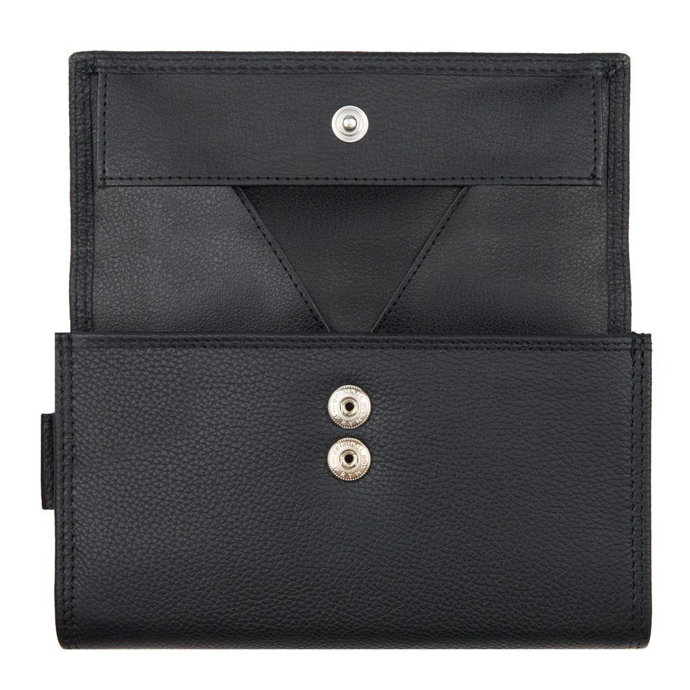 6 Notenfächer, 1 Münzfach mit Schüttrand, 1 Steckfach, 1 Steckfach aussen, 1 Öse für Kettenanbringung, 2 Druckknöpfe