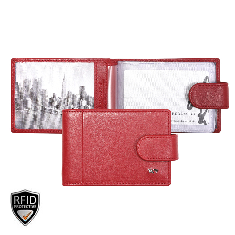 1 RFID Hacker Protection, 1 Klarsichteinlage – 10 Kreditkarten, 2 Fotofächer, 1 Sicherheitsverschl. mit Druckknopf, außen