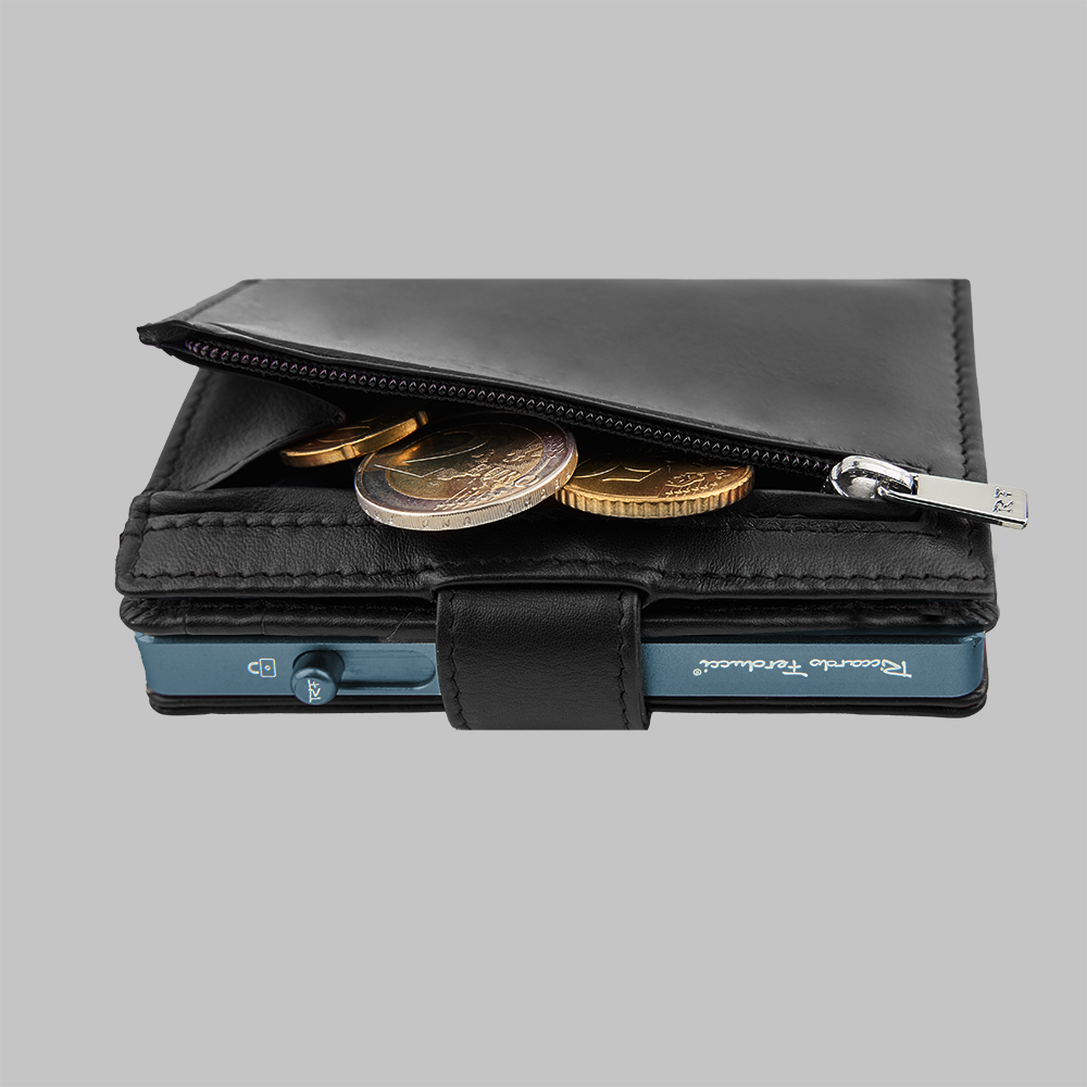 1 RFID Hacker Protection, 2 Kreditkartenfächer, 1 SafeBox Kartenhalter m. Lock-System 5-6 Karten, 4 Kreditkartenfächer im Notenfach, 3 Steckfächer, 1 Notenfach, 1 Sicherheitsverschluss, mit Druckknopf, dehnbar, 1 Münzfach mit RV auf der Rückseite, Mit innovativem Schließsystem für maximale Sicherheit Ihrer Karten.