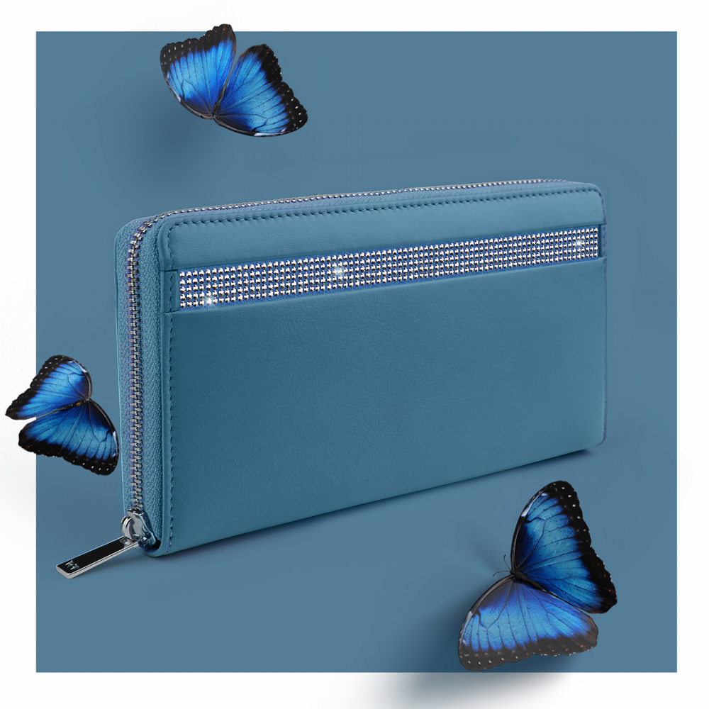 1 RFID Hacker Protection, 3 Notenfächer, 12 Kreditkartenfächer, 2 Kreditkartenfächer im Steckfach, 1 Steckfach mit Klarsichtfenster, 1 Münzfach mit RV und Falte, 1 Fach für Einkaufswagen-Jeton, 1 Münze für den Einkaufswagen, 1 Schlüsselfach, 2 Steckfächer, verziert mit 395 Kristallen aus Österreich