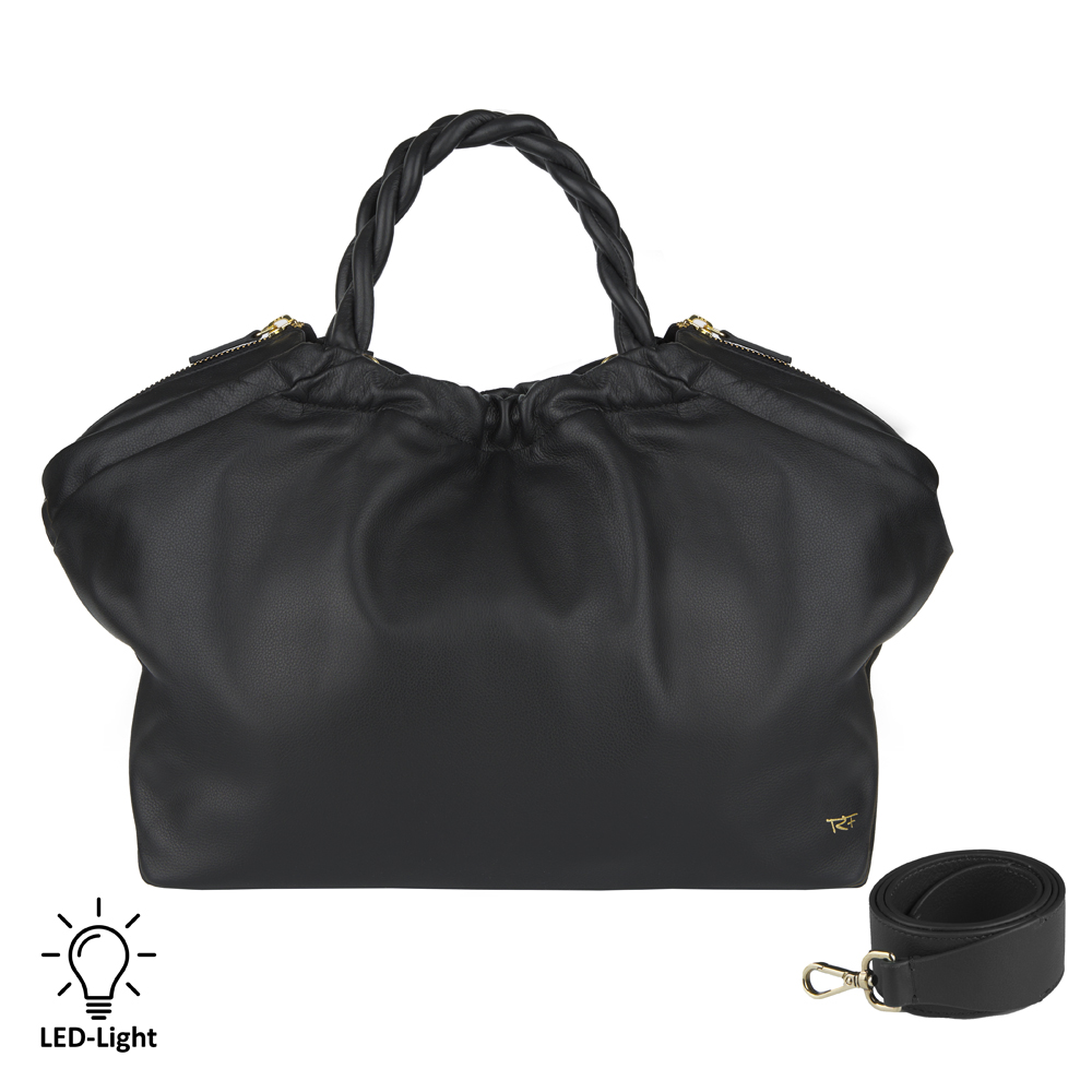 2 Tragegriffe, 1 Trageriemen, abnehmbar, 1 Hauptfach, groß u. geräumig mit Magnetverschluss, 1 Trennwand mit RV-Fach, 1 Schlüssel-Band mit Karabiner, 1 LED-Licht Halterung, 2 Kugelschreiber-Schlaufen, elastisch, 1 Reissverschlussfach, 1 Handyfach, LED-Licht nicht enthalten