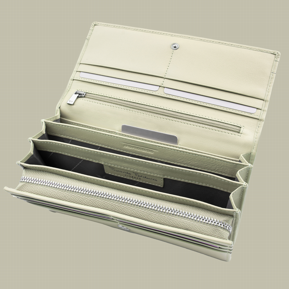 1 RFID Hacker Protection, 11 Kreditkartenfächer, 1 Münzfach geteilt, mit RV, 1 Fach für Einkaufswagen-Jeton, 1 Schlüsselfach, 3 Notenfächer, 1 Steckfach, 1 Reissverschlussfach, 1 Steckfach aussen