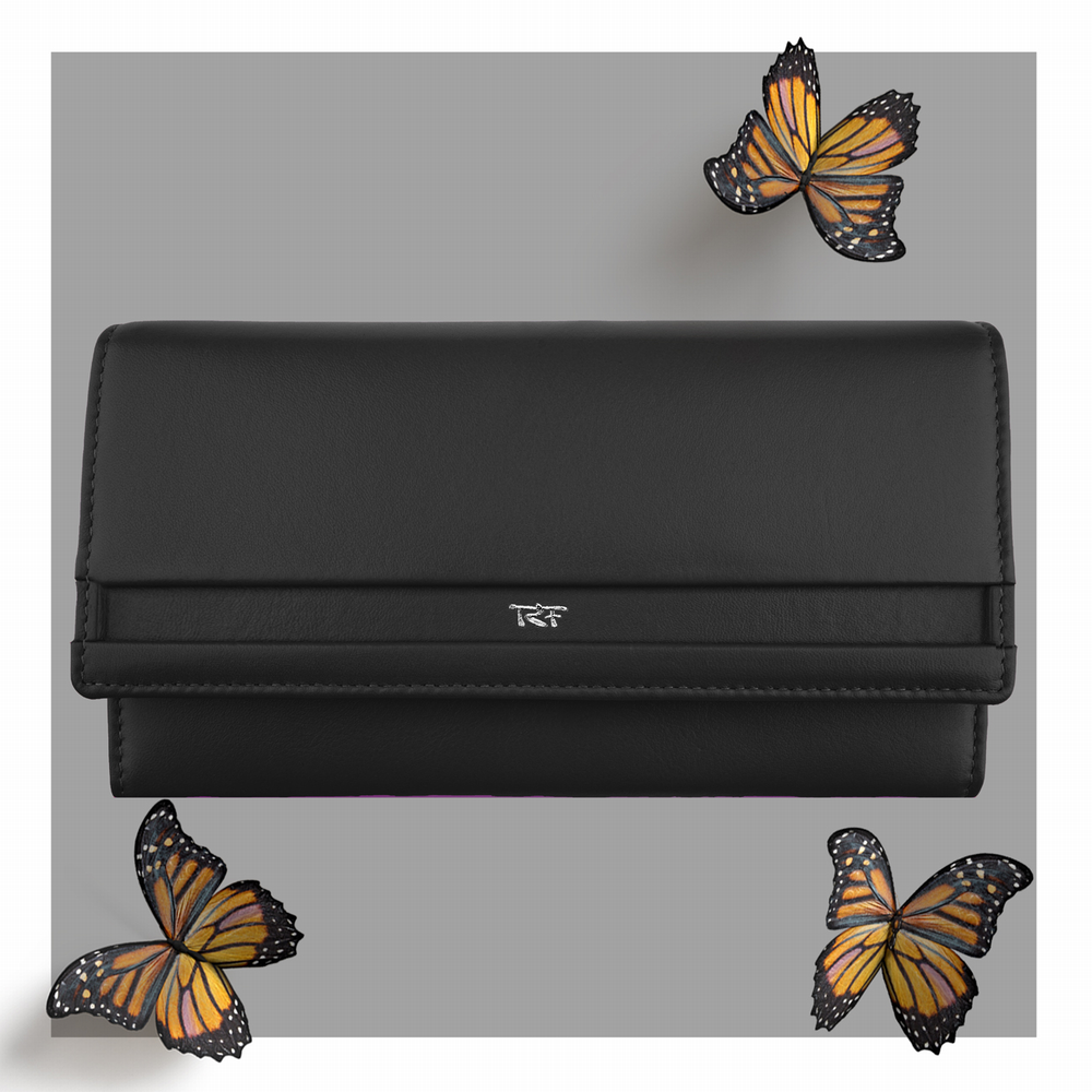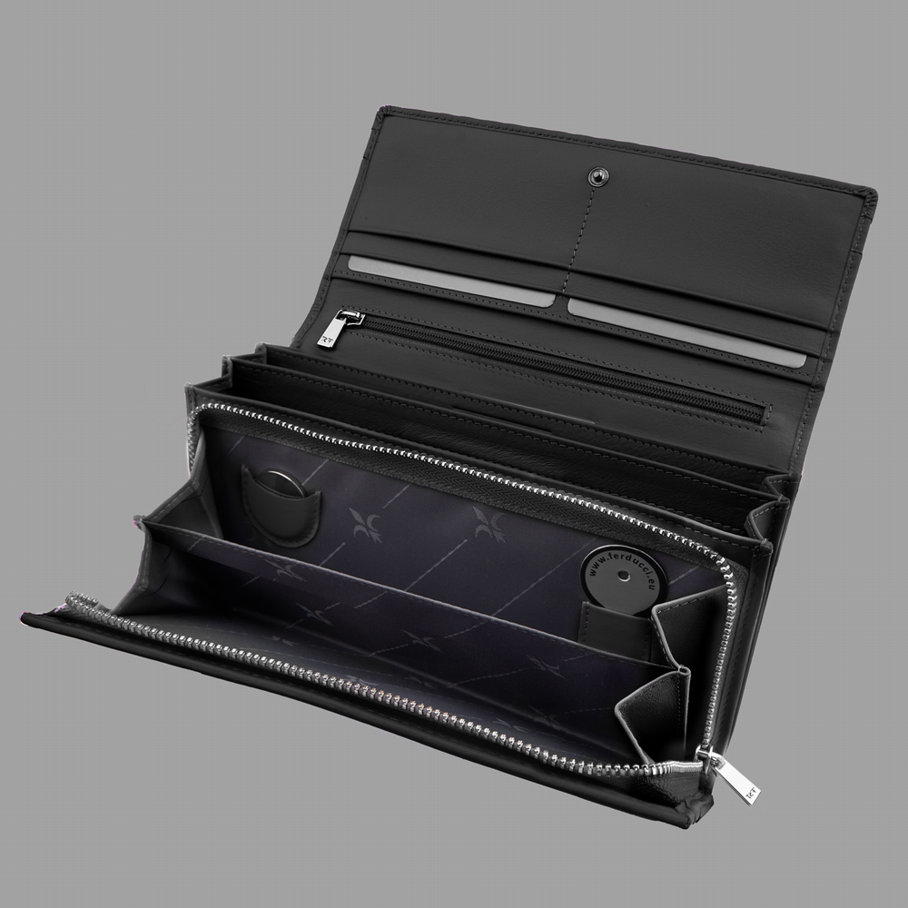 1 RFID Hacker Protection, 15 Kreditkartenfächer, 1 Münzfach get. mit Bügelverschl., 1 Fach für Einkaufswagen-Jeton, 1 Münze für den Einkaufswagen, 1 Schlüsselfach, 3 Notenfächer, 1 Steckfach, 1 Reissverschlussfach, 1 Steckfach aussen