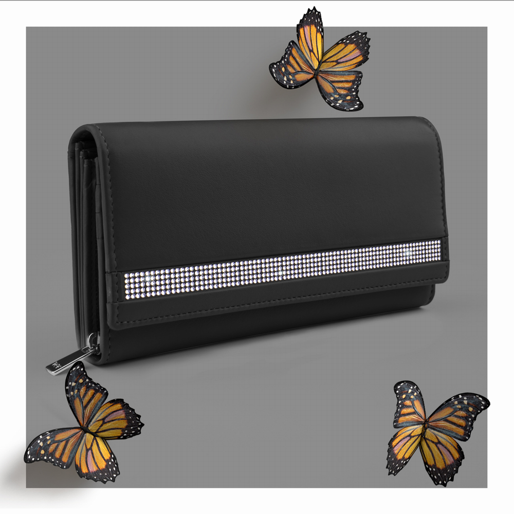 1 RFID Hacker Protection, 15 Kreditkartenfächer, 1 Münzfach geteilt, mit RV, 1 Fach für Einkaufswagen-Jeton, 1 Münze für den Einkaufswagen, 1 Schlüsselfach, 3 Notenfächer, 1 Steckfach, 1 Reissverschlussfach, 1 Steckfach aussen, verziert mit 395 Kristallen aus Österreich