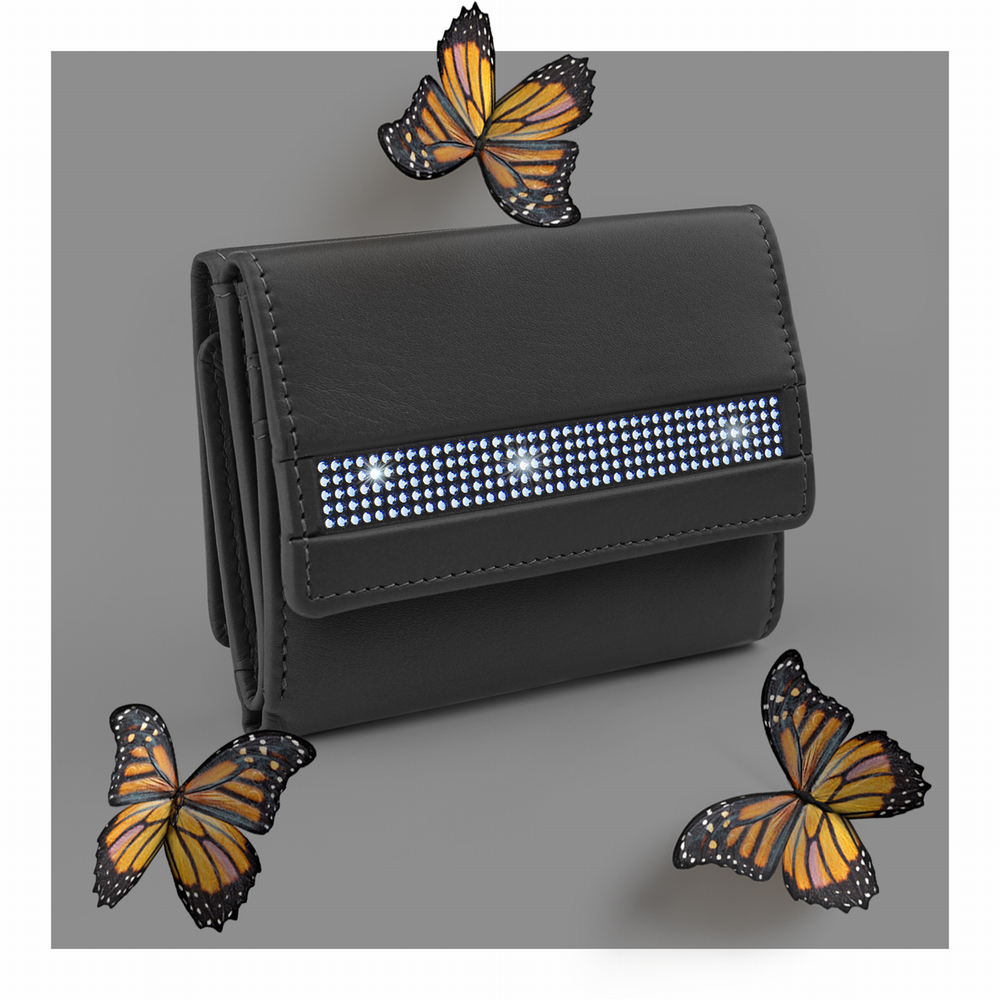 1 RFID Hacker Protection, 5 Kreditkartenfächer, 1 Münzfach, 1 Fach für Einkaufswagen-Jeton inkl. Jeton, 1 Schlüsselfach, 2 Notenfächer, verziert mit 200 Kristallen aus Österreich