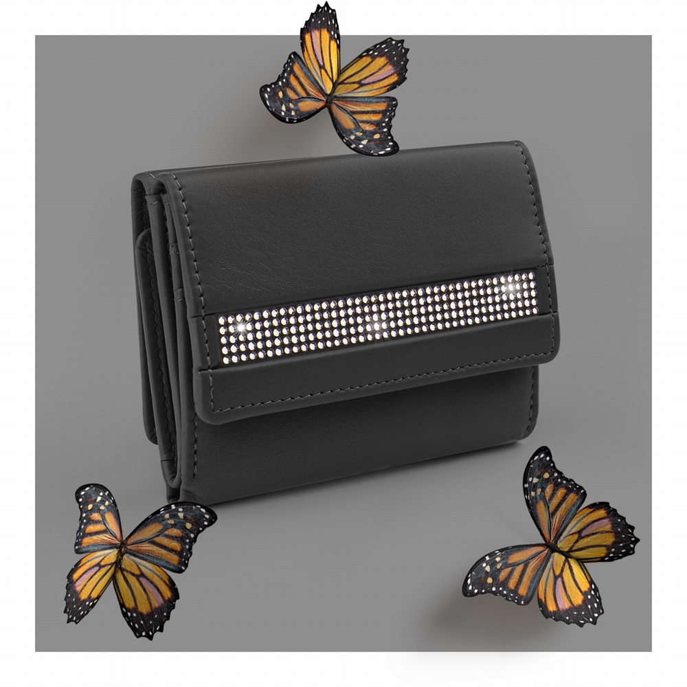1 RFID Hacker Protection, 1 Steckfach, 5 Kreditkartenfächer, 1 Münzfach, 1 Fach für Einkaufswagen-Jeton, 1 Münze für den Einkaufswagen, 1 Schlüsselfach, 2 Notenfächer, verziert mit 200 Kristallen aus Österreich