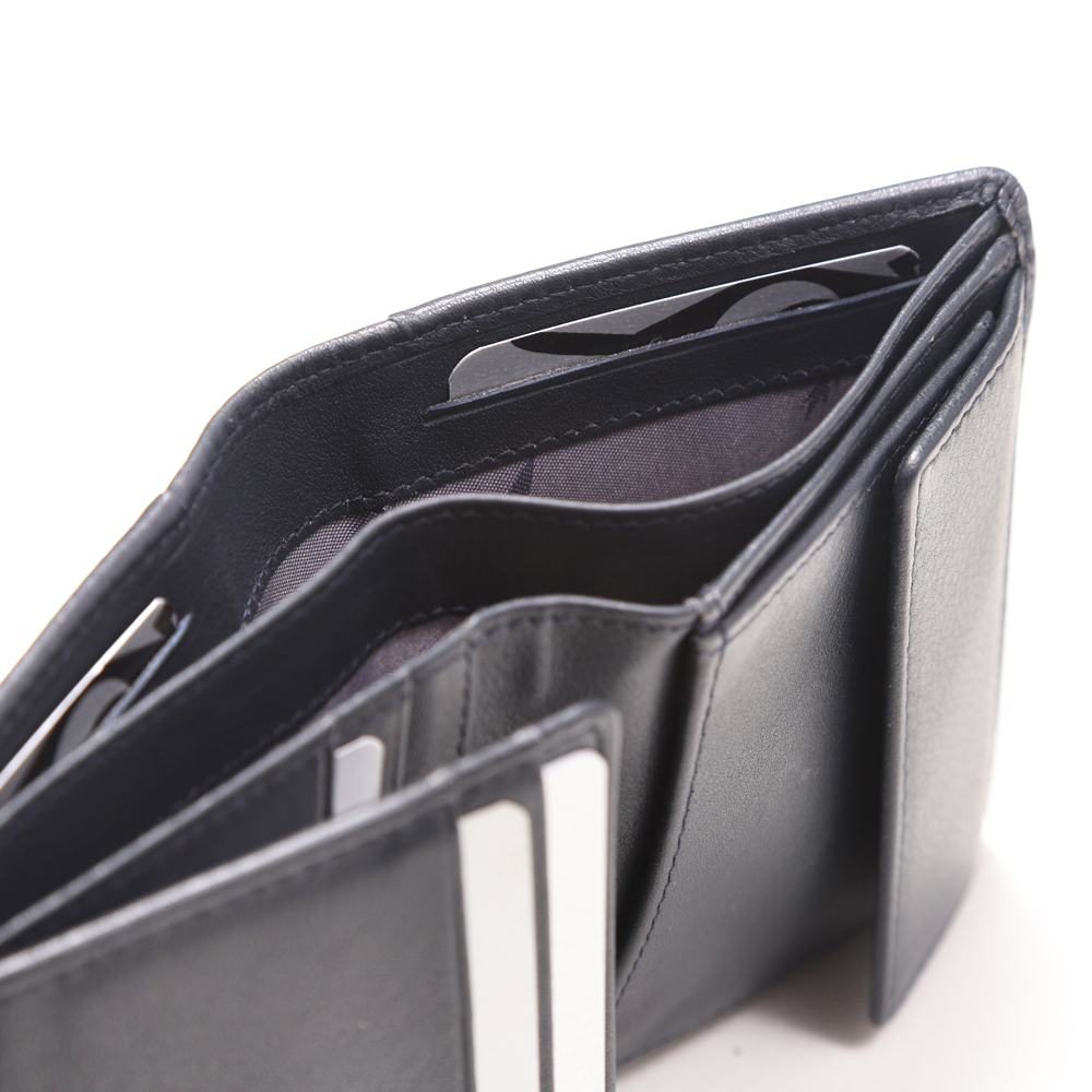 1 RFID Hacker Protection, 2 Notenfächer, 1 Münzfach, 4 Kreditkartenfächer, 2 Kreditkartenfächer im Notenfach, 2 Steckfächer, 1 Klarsichtfach, RFID – Radiofrequenz-Identifikation. In diesem Produkt wurde eine spezielle RFID-Schutzfolie eingearbeitet. Ihre Kredit- und Versicherungskarten sowie Personalausweise, sind somit vor Datendieben geschützt.